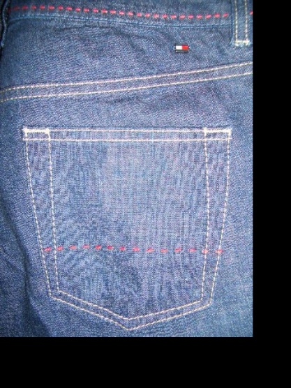 tmavě modrá bavlna, zajímavě ozdobně prošívané červenou, na zadečku kovový znak TH