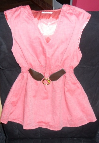 Predám nádherný top staroružovej farby velkosti 38.Topík je nenosený len vyskúšaný.Topík je jemne do áčka v strede flexibilná guma s našitým páskom hnedej farby,so zlatou sponou.Materiál je ako jemné plátno,zo 100percentnej bavlny.Vnúti je saténová podšívka.Moja cena 350 kč včetne pošty