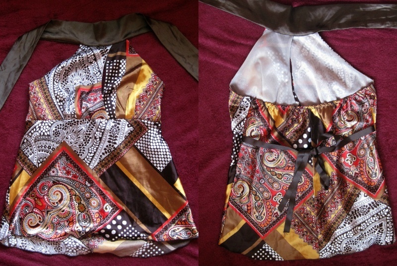 Asi dvakrát nošený krásný top na zavazování za krkem v podzimních barvách, se zajímavým vzorem, bohužel jsem cedulku se značkou ustřihla, takže si nepamatuji, kde jsem ho koupila.