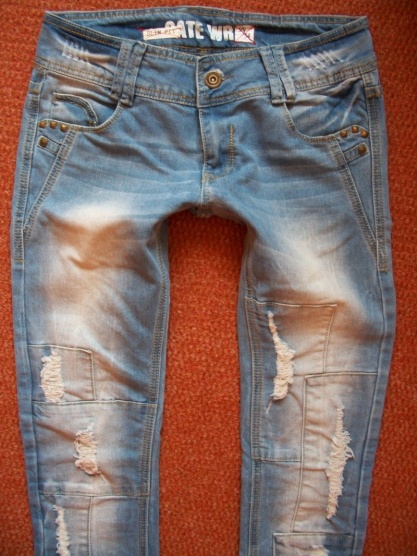 Nové, nenošené džíny zn. Gate, velikost 38, zajímavě řešené, záplaty doplněné trháním. Míry : délka 102cm, pas 39-42cm, boky 46-49cm, přední sed 19cm. Cena 250Kč včetně doporučené pošty.