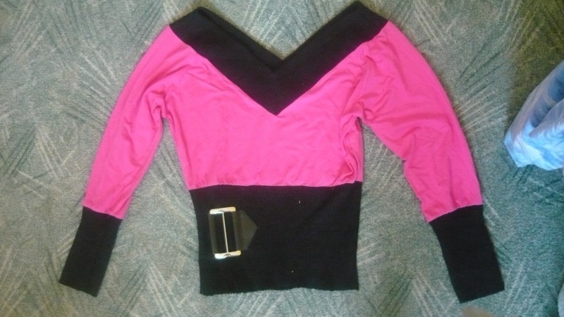 0Výstřih do V má i na zádech.Je velice pohodlné.Opasek má výraznou sponu.Je koupený na dovolené,ve výborném stavu.Nechám za 150,- vč pošty