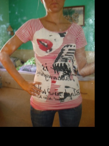 Nabízím červeno bílé proužkované tričko s potiskem v předu. Je delší, vhodné i legínům.Velikost S.Cena:180 + 40 pošta