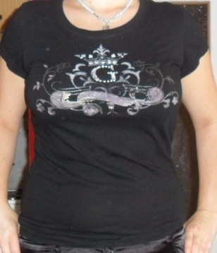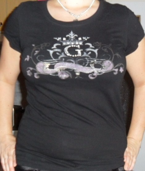Predám čierne tričko guess velkosti M,ale podla rozmerov zodpovedá tak L.Tričko je nosené ale je v dobrém stavu.V strede je potisk s písmenom G s kamínkovou aplikací.Rozmery: volne položené tričko: