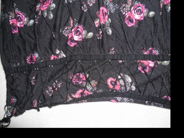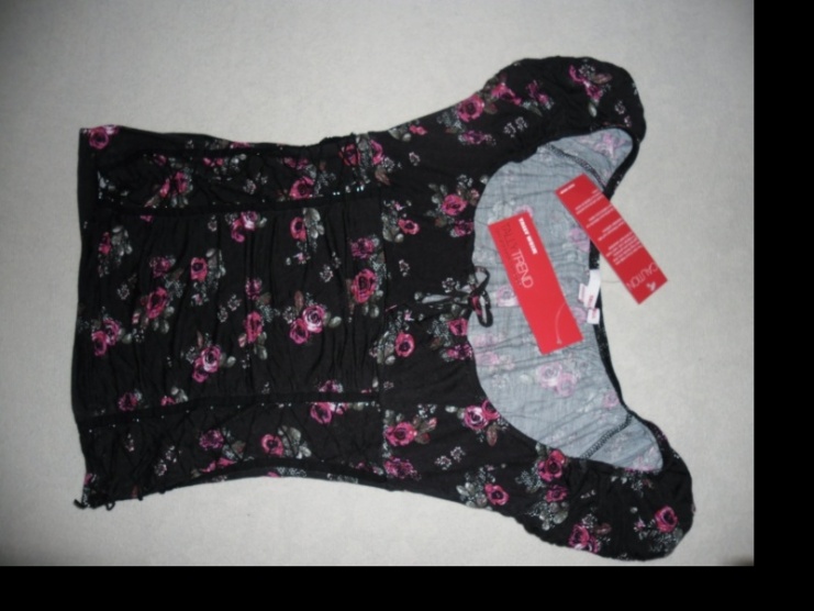 Elastické tričko s jemným motivem květin a hlubokým dekoltem se zavazováním na mašličku. Tričko je zcela nové ještě s cedulkami. Korzetový typ. Unáhlená koupě. Cena je i s poštovným. Složení: 95% viskóza, 5% elastan.