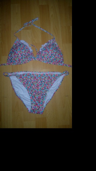 Roztomilé trojúhelníkové bikiny s květinovým potiskem od b.p.c. beach. Se zavazováním na šíji, na zádech se sponkovým zapínáním, s vyjmutelnými měkkými košíčky, vrchní díl s volánky a mašličkou. Úzce střižený spodní díl. Vhodné pro košíčky vel. AA - B. 80% polyamid, 20% elastan, podšívka: 100% polyester