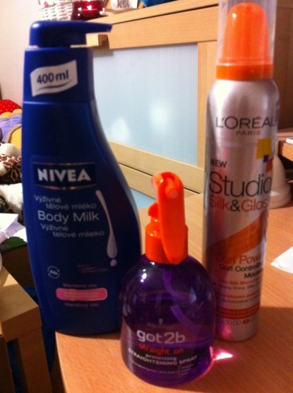 Prodám tužidlo loreál silk gloss na podporu vlnek (200ml) ,sprej od schwarzkopf got2b pod žehličku na vlasy (200 ml) a nivea body milk tělové mléko (400 ml).Tužidlo a sprej jsou jednou použité, mám přípravkú na vlasy spoustu takže to nevyužiju.Mléko je nepoužité.Cena - 230 včetně pošty