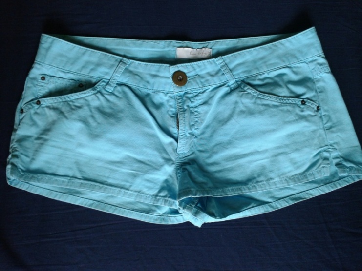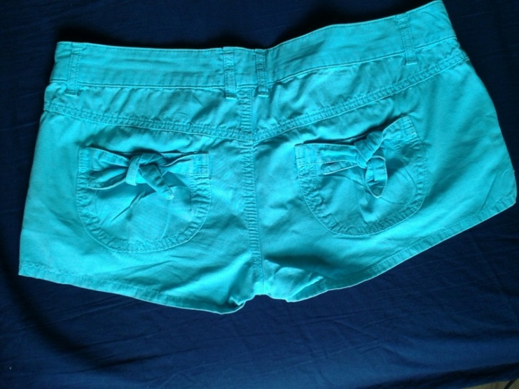 Tyrkysové letní kraťásky s mašličkami na kapsách, zn.Zara, velikost 38. Délka vpředu je kratší jelikož je pas posunut níž vpředu než vzadu, a vpředu tedy kratasky začínají pod pupíkem.