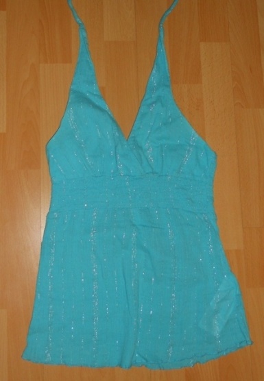 0Tyrkysové tílko se zavazováním za krk, minimálně nošené, žádné známky obnošení, jako nové. Prošité stříbrnou nití.