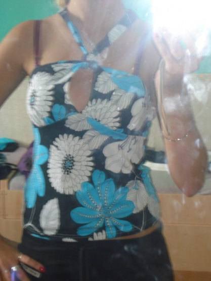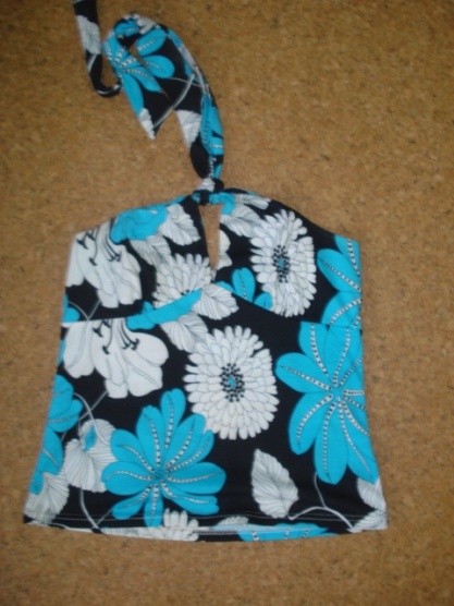 Prodám toto tyrkysovo-bílé tílečko na zavazování za krk. Ve předu kulatý výstřih. Cena 180 Kč