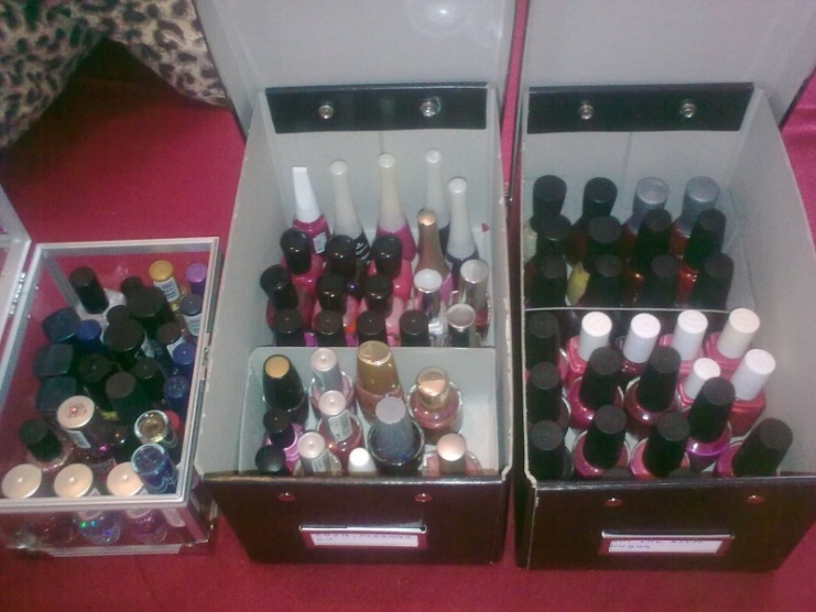 Kdysi jsem si udělala v krabici od bot takový přihrádky, že měl každý lak svůj chlíveček, sice bylo fajn, že byly mobilní a neprášilo se na ně, ale zase nebylo vidět na odstíny a pak se mi tam už nevešly..