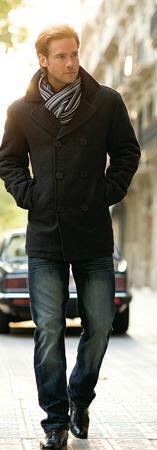 Na podzim a v zimně hodně nosí něco podobného, jako na druhém obrázku. Když vymění modré rifle za šedočerné, tak se s tím dá jít i do neformální společnosti.