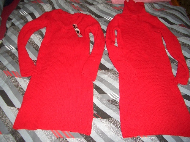zářivě červené, mám je od loňska a letos je nosit asi nebudu, mám už jiné, ve kterých se sama sobě líbím více. Vlevo s véčkovým výstřihem, vpravo s rolákem. Materiál akryl. Velikost univerzální, hezky pruží, ale více jak Lko bych do nich nedoporučila. Položené až tak nevyniknou, hezky se přizpůsobí do všech stran, takže i výstřih lze výše nebo níže jak kdo má rád. Značka Tessa - Polsko. Detail materiálu s hrankování v detailu. vyměním třeba za pěknou sisley kabelku, mugler angel i použitý, nebo prodám, zájemkyni prosím SZ