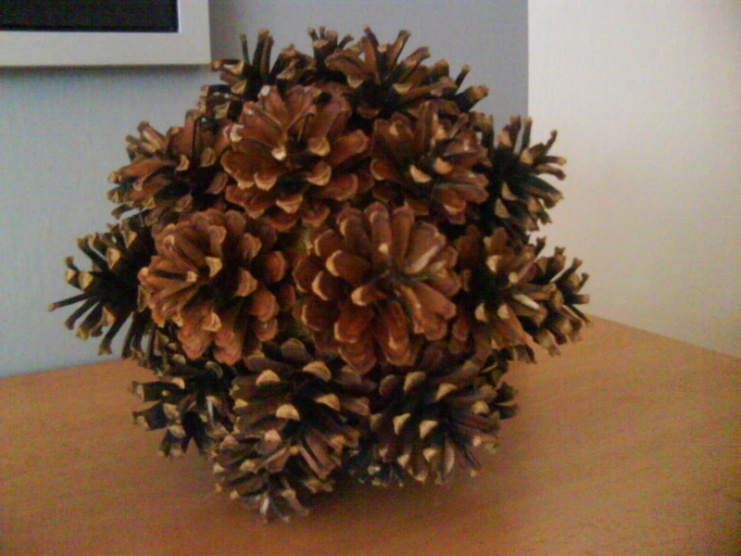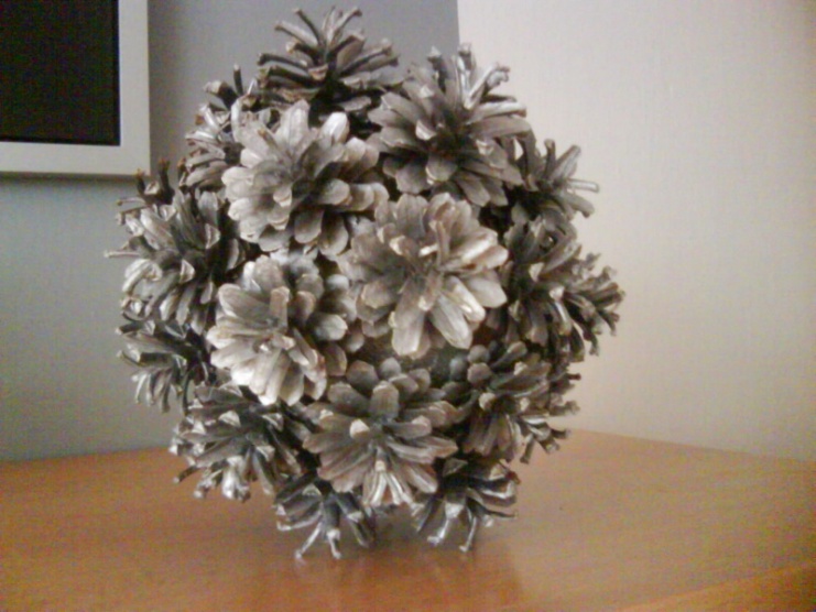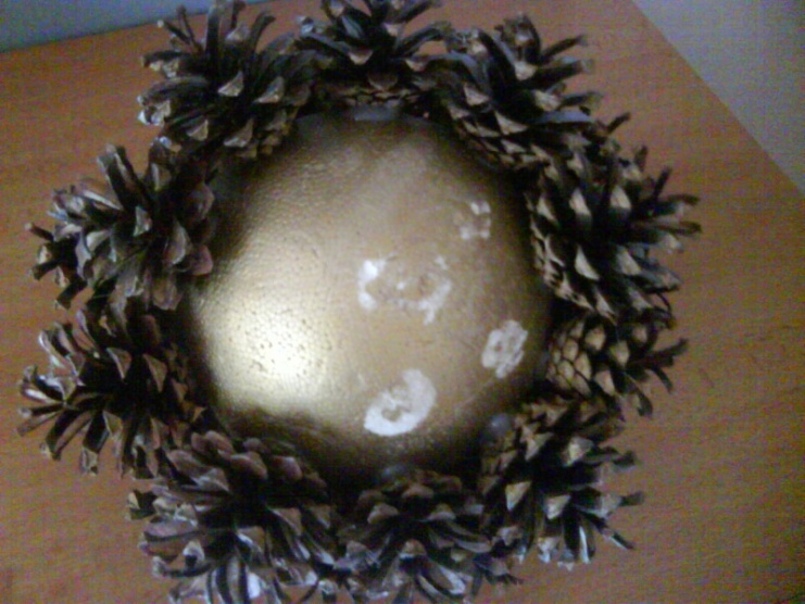 Reaguji na Verys: Tak tady je slibovaný obrázek. Na polystyrenovou kouli nalepíš tavnou pistolí jednu šišku vedle druhé a potom přestříkáš a popřípadě posypeš glitry nebo můžeš nechat kouli jen tak...