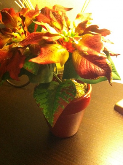 Minulý rok jsme měli Vánoce stříbrno-červeno-zlaté. Měla jsem k tomu vyrobený pěkný věnec (světlý slaměný, s úplně stejnýma ale mini baňkama jako na stromku, bílé svíčky se zlatýma hvězdičkama a ještě tam byla skořice a badyán). Ubrousky s červenýma a zelenýma sobama. A zelený plstěný vystřihovaný dlouhý úžší pruh na stůl s motivem sobů (má to svůj název, nemůžu si na něj teď vzpomenout). Možná až budu dělat výzdobu tak to vytáhnu a vyfotím