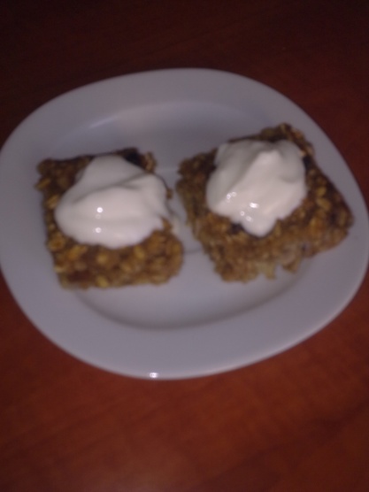 Jako vždy jsem to trochu upravila dle sebe, hlavní změna asi byla že jsem použila lžičku kokosového oleje a místo jablečného pyré nastrouhanou hrušku. Ještě jsem tam přisypala pšeničné klíčky, slunečnicová semínka, prostě co dům dá. Nevydržela jsem a hned ještě večer kus snědla. Ráno na snídani jsem ji ohřála a se lžičkou jogurtu. Ale to je fakt jedna z největších dobrůtek. Už se těším na ráno, bude zase.