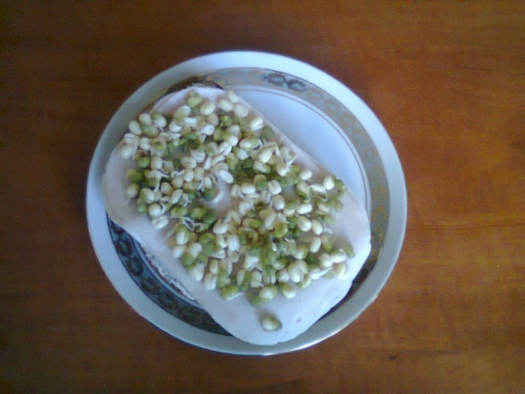 Ještě jsem našla fotku ze snídaně. Slunečnicový chléb namazaný slabou vrstvou lučiny, s krůtí šunkou (96% masa) a posypaný naklíčenými fazolemi mungo. Mungo je fakt úžasně chutné, pak ještě mohu doporučit naklíčenou čočku. Obsahují spoustu minerálů a vitamínů. S množstvím opatrně, denně sníst max. jednu hrst klíčků. Ale nevím proč.