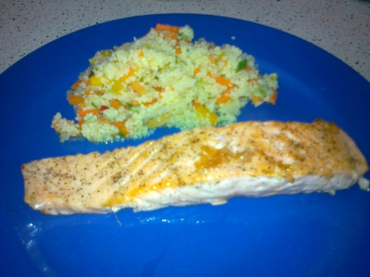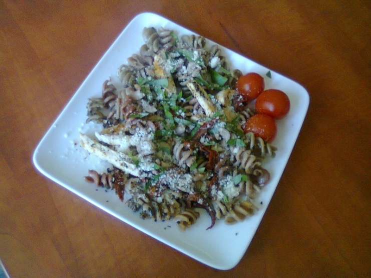 1. celozrnné těstoviny s kuřecím masem, sušenými rajčaty, bazalkou a posypané parmezánem. Omastila jsem to olejem z těch sušených rajčat. Moc jsem si pochutnala.