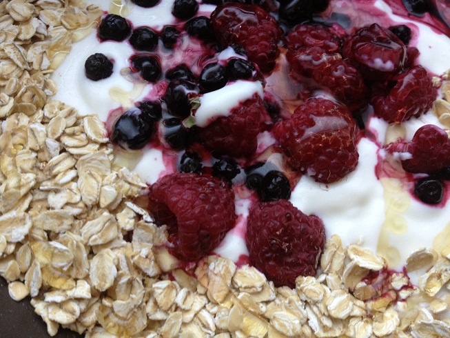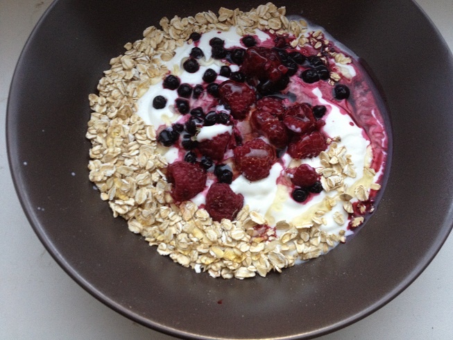 A snídaně (pro změnu jogurt - ne tvaroh). Skvěle to vypadá a úžasně to chutná. Doporučuju ale před konzumací promíchat, aby se vločky jogurtem nasákly, jinak to není moc dobré. A taky doporučuju jíst vločky spíš v jogurtu, než ve tvarohu, protože ve tvarohu se moc nenasáknou a nejsou moc chutné.