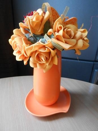 0Výška i s květinami je 20 cm. V ceně je vázička, umělé květiny a oranžový porcelánový talířek, na kterém vázička stojí. Původní cena 199 Kč. Osobní odběr Brno.