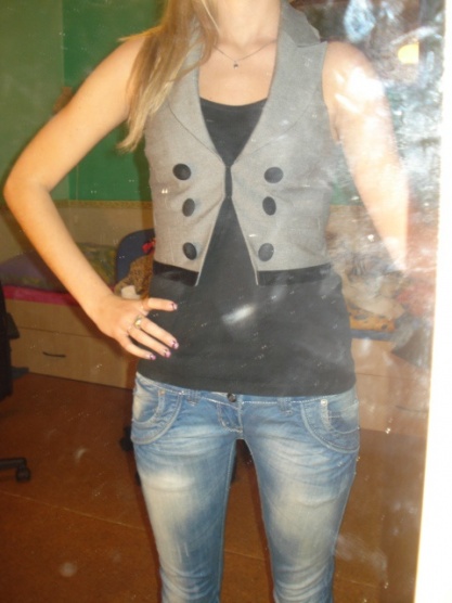 Nabízím elegantní vestičku v černo-šedé barvičce a velkými černými knoflíky.