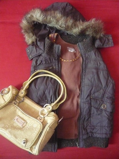 Prodám vestičku s kožíškem v tmavě hnědé barvě a velikosti M,pod tím tílko okrové s kamínky-chybí tři kamínky-velikost S/M, kabelka Gussaci zlatá. Cena všeho včetně pošty je 700kč. Stav vše nové kromě tílka.