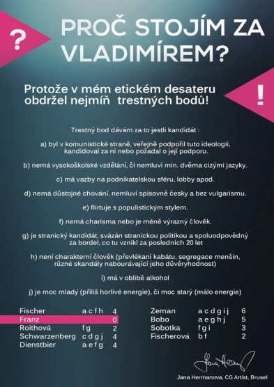 Reaguji na KRAZYMAE: Franz je "šašek". Prezident má ČR reprezentovat a né ji zesměšnit. O to se postaral už mistr Klaus, díky amnestii. Kdyby měl, už jen do politiky, Franz jít, tak bych se propadla hanbou ! I kdyby to tetování neměl, politice vůbec nerozumí. Říká to, co chtějí lidé. Toť můj názor. Budu volit Fischera ! Reprezentativní, za působení ve vládě, vláda alespoň nějak fungovala. Má ucelené názory, né ja Mimoň, pardon, Miloš Zeman, který by na hradě jen chlastal a četl.