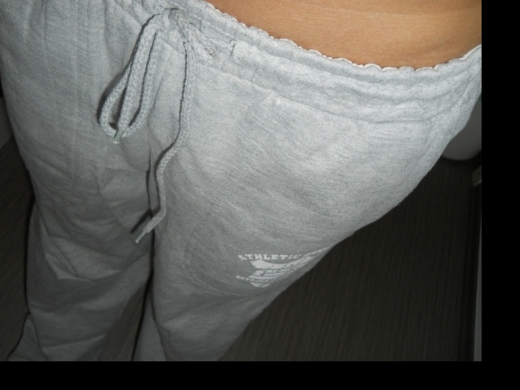 Šedé nošené volnější tepláky na gumu a šňůrky. přes pas v klidu 34cm, délka 103cm. Velikost možná i L, jsou dost volné.