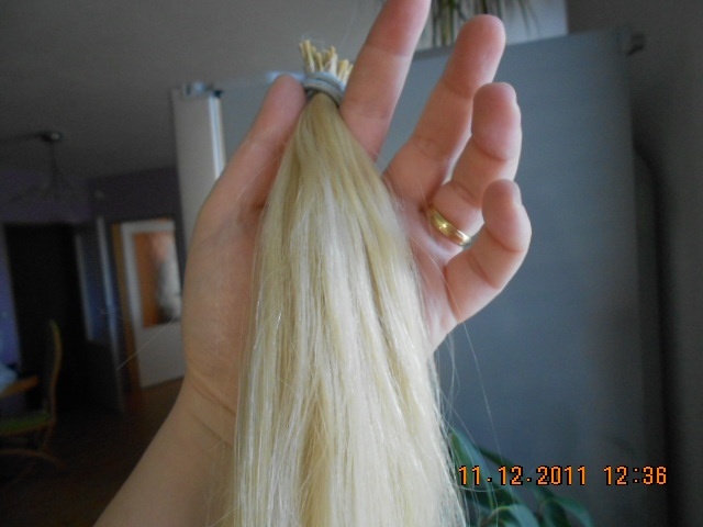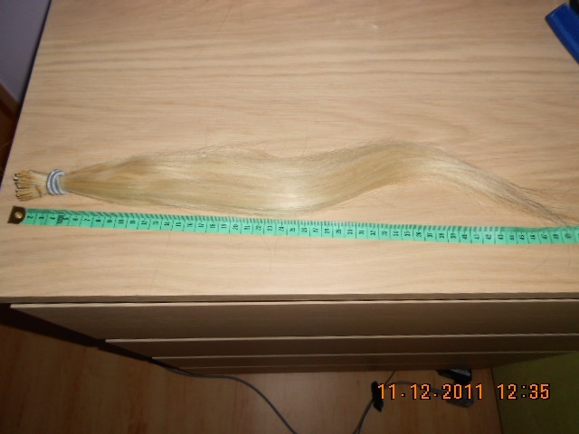 Prodám východoevropské blond vlásky k prodloužení, délka pramenů je 40-50cm (nejkratší 40cm a nejdelší 50cm). Na pramíncích jsem nechala udělat úplně nové spoje, vlásky byly nošené 3 měsíce. Spoje ve tvaru "I", vhodné na micro-ring, bellargo a nebo bond. Pramínků je 70 ks.