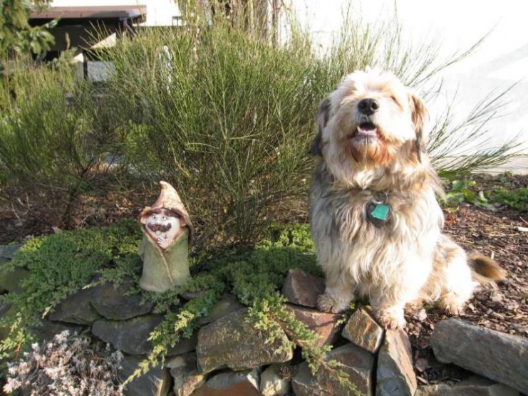 Na dalším fotu jsou mí zahradní skřítci ... Ten chlupatý je živý