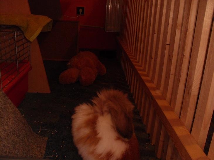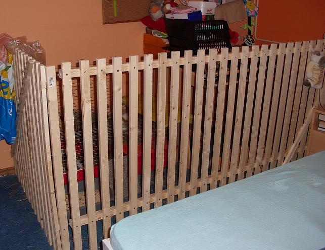 Jinak posílám fotku naší ohrádky. Má dobrou třetinu pokoje jen pro sebe. nechtěli jsme ho nechávat jen v kleci, ale v noci jsme se báli, aby neskočil do postele a nakonec začal i do tý postele čůrat a to jsem řekla že dost.