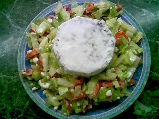 80g rajčat.80g papriky,80g okurky,80g ledového salátu,80g cottage,trochu soli a 100g hermelínu.Vše pokrájíme a promícháme,nahoru hermelín a dobrou chuť.Jo,ten hermelín 20-ti %...
