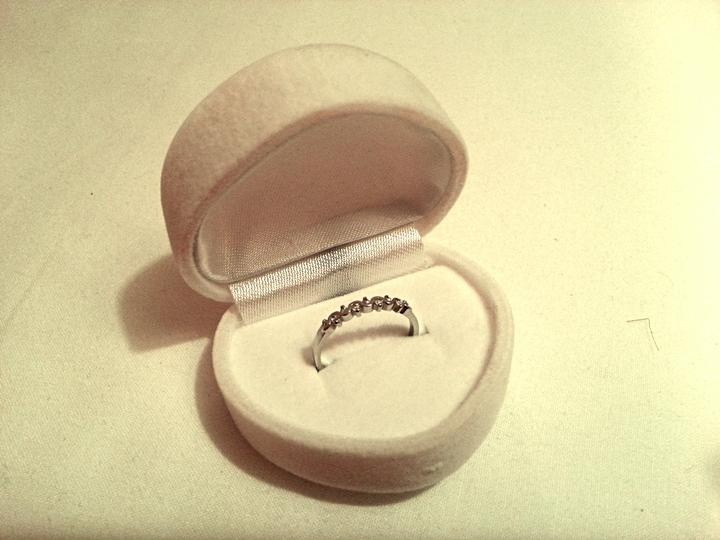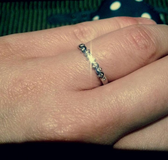 Prstýnek vybral můj nastávající a moc se mi líbí. Je to bílé zlato. Líbí se mi, že je jemný a nepřekáží mi. Krásně se leskne na ruce. Jsem z něj nadšená a jiný bych nechtěla. Nemám ráda prsteny které by se mi o něco zachytily nebo mi překážely. Krom zásnubního jiný nenosím, takže mně se trefil přesně do vkusu ... i zásnuby byly pohádkové. Při západu Slunce nad oceánem.