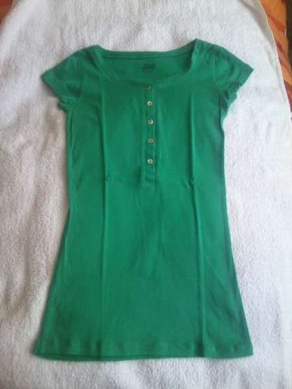 0Tričko je úplně nové, pouze vyzkoušené. Na fotce vypadá tmavě, ale je hezky trávově zelené. Je delší, skvěle se hodí místo tuniky k legínám. Perleťové knoflíčky.