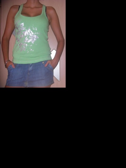 Zelené, vroubkované tílko Fishbone se stříbrnou aplikací kytek a štrasovými kamínky(žádný kamínek nechybí). Tílko je o něco výraznější barvy než na fotkách. Je prošívané stříbrnou nití. Je málo nošené. Velikost je S dle mého názoru i M (velmi pružné). Vnitřní cedulka po straně ustřihlá. Na prodej i sukně. Cena 59 Kč + 40Kč pošta.