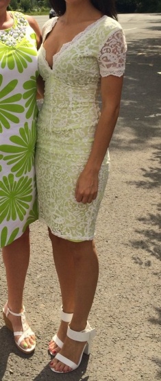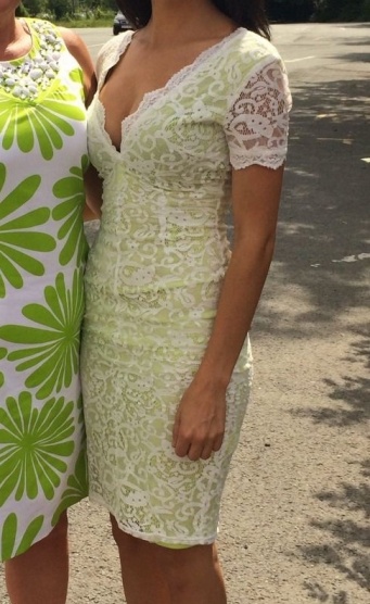 Krásné společenské krajkové šatičky, nové s visačkami. Jsou velmi pružné, velikost UK 8, padne na S i M. Mají 2 vrstvy, první zelenkavá z bavlny - žádný umělák, druhá bílá krajková. Délka ke kolenům, zapínání vzadu na zip.