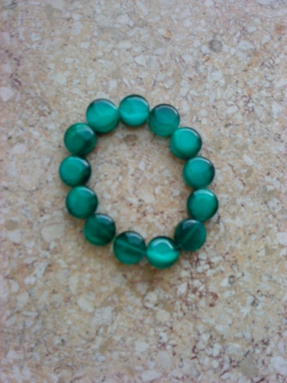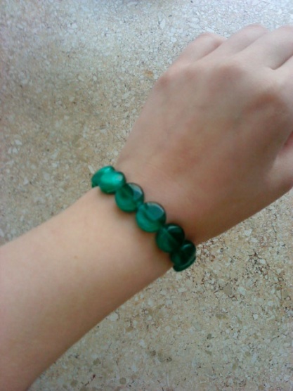 Zelený náramek, který na ruce vypadá moc hezky. Doporučuji k němu ještě zelený náhrdelník, který mám v bazárku také. Vypadají šmrncovně k čenému oblečení.