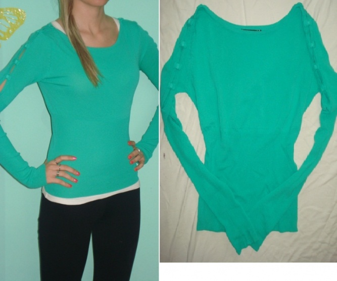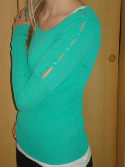 Nabízím tento zajímavý zelený svetřík s děravými rukávy.
