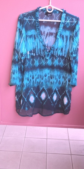 Zajímavá letní tunika s batikovým vzorem, tyrkysově zelená, rozměry jsou - délka tuniky je 70 cm, 50-54cm přes prsa, klasický rukáv, délka 3/4teční, může se zahnout, ideální k legínám. Výstřih ozdoben nabranou látkou dokanýrků a zapínání na 4knoflíčky.