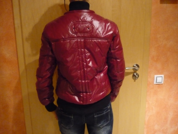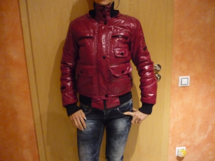 Tmavě červená, teplá, zimní bunda z lesklého materiálu velmi málo nošená 1 rok stará.Cena 400 Kč.