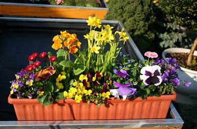 Na obrázku je sedmikráska, maceška, petrklíč a narcis. To jsou ale kytičky jen na jaro, vydrží tak měsíc.