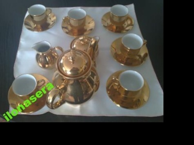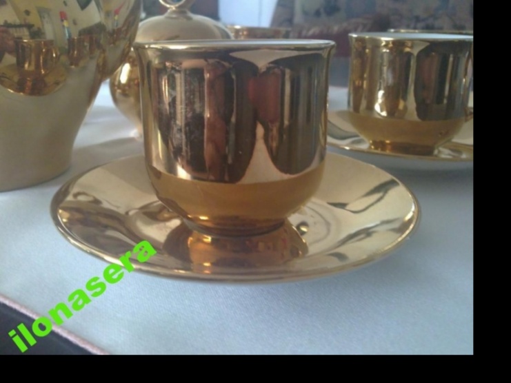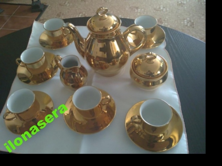 zlacený servis po rodičích,bylo to pouze vystavené.6hrníčků,talířků,konvička,mlékovka,cukře nka cena 750+ 100 poštovné,pouze vážné mu zájemci.Cena je dána.Děkuji