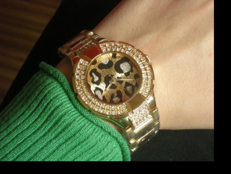 Zlaté hodinky s leopardím ciferníkem a nápisem Guess