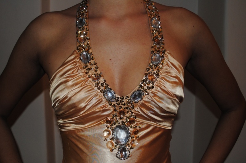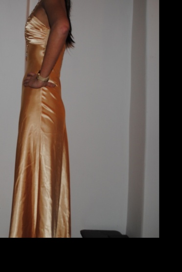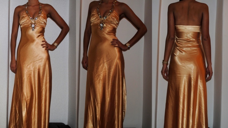 Krásne dlhé šaty pre štíhlu postavu. Zloženie 97% polyester, 3% elastan. Nakoľko sú lesklé naozaj odporúčam štíhlym ženám bez bruška. Sú krásne dlhé na výšku 185cm bez podpatkou siahajú po zem, v prípade nižších sa utvorí vlečka. Výstrih je do tvaru V, môžné použiť s lepiacou podprsenkou. chrbát holý. Pás max do 70 cm.Použité raz na spoločenskú udalost.Pôvodná cena 130 eur, cca 3300, takže cena si myslím že je naozaj primeraná. Na foto nie sú šaty bohužial vyžehlené, takže v skutočnosti sú krásne lesklé a hladké. V prípade dohody možnosť aj zapožičať.