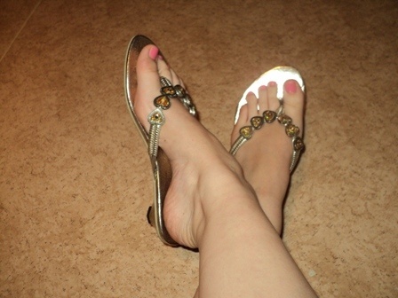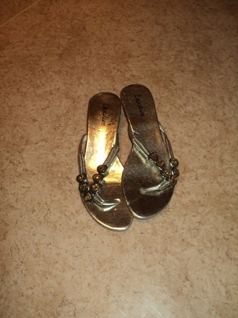 0Prodám zlaté žabky zdobené malými srdíčky. Botky jsou na malém podpatku, takže chůze je pohodlná.