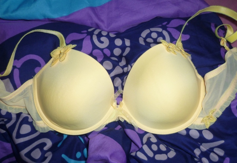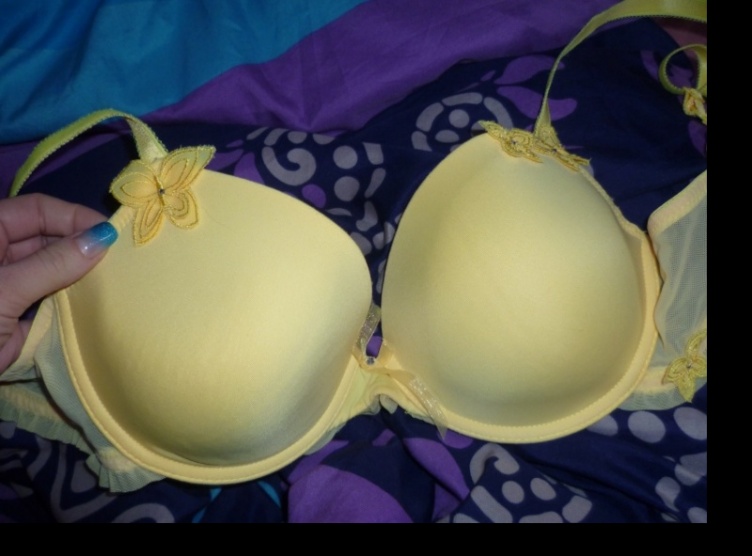 Prodám nošenou, ale stále hezkou podprsenku žluté výrazné barvy s ozdobnými motýlky. Velikost odpovídá. Může nosit možná i větší B.