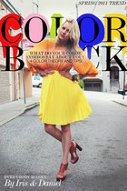 Cca před 3 roky jsem si taky koupila žlutou sukni a přesně jako ty, nevěděla jsem, co k ní nosit. Měla jsem ji asi dvakrát an sobě a vím, ež už ji nikdy na sebe nevezmu...podle mě k ní jde max. tak nějaký černý jednoduchá tričko/tílko/halenka. Možná ještě něco modrýho...na jiný barvy bych asi odvahu neměla.