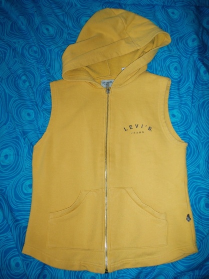 Pěkná, jak nová vestička Levi's. Darovala me ji sestra a moc jsem ji nenosila, každopádně není nová. Mě je bohužel malá přes prsa. Snad ještě někomu poslouží. Žlutá, s kapucí se zipem a dvěma kapsami,které vypadaji jako klokani,ale skrz zip neni.
