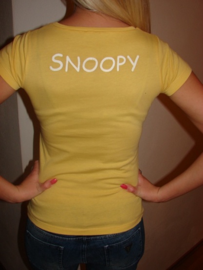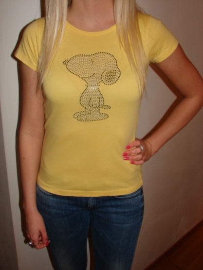 Krásné kanárkově žluté tričko SNOOPY, obrázek je celý z černých a stříbrných kamínků, žádný nechybí, na zadní straně bílý třpytivý nápis snoopy, minimálně nošené v super stavu, zn. HaM, stejné vyrabí i bershka, vel. S, rozměry: délka 57cm, šířka 38cm. Cena 249Kč. Poštovné 37Kč.