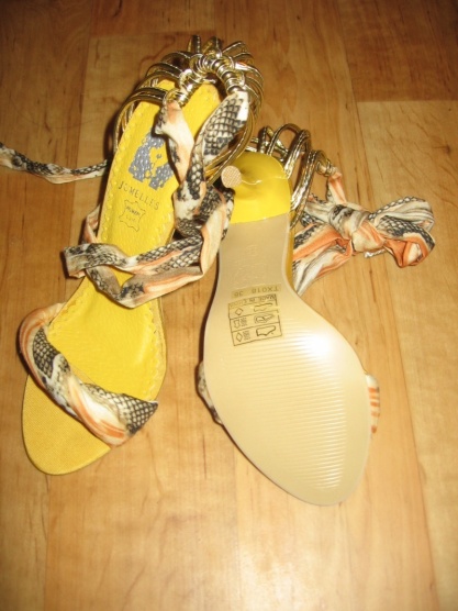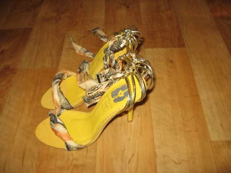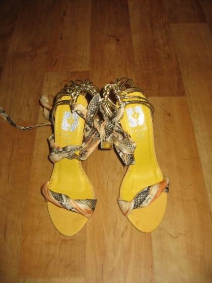 Tyto mají zlaté pásky, držící pevně patu a vázací mašličky ve žlutooranžové barvě se vzorem, jak je vidět na fotkách.