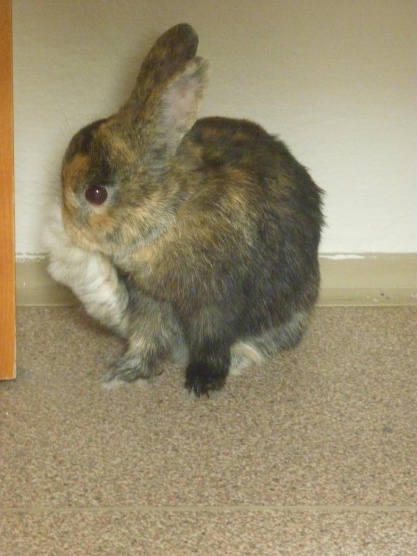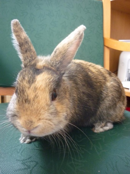 Nakonec jsem do práce pořídila králíčka. Podařilo se mi sehnat naprosté zlatíčko. Na jednu stranu je to ďáblík, ale vyřádí se se mnou v kanceláři a pak by se u lidí nechal umazlit! Je úplně úžasné, když vidíte lidi, kteří už jsou např. ležící, nekomunikují, jak koukají na tu prdelku a drbou a drbou a mají úsměv na rtech ještě několik dní. Taky je naprosto skvělým prostředníkem u lidí, kteří se nechtějí svěřit, něco je trápí...A přes králíčka "vykecají" všechno!